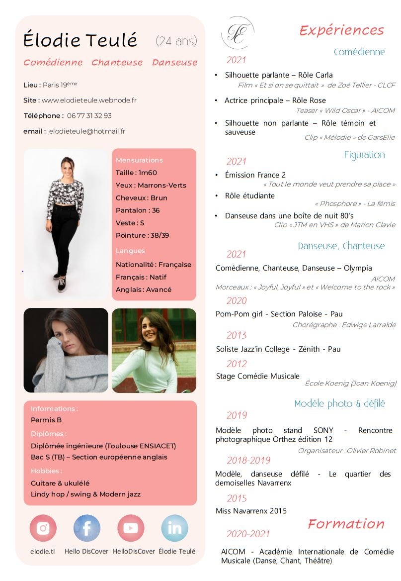 Salut ! Moi c'est Élodie, j'ai 24 ans et je suis comédienne, chanteuse, danseuse.